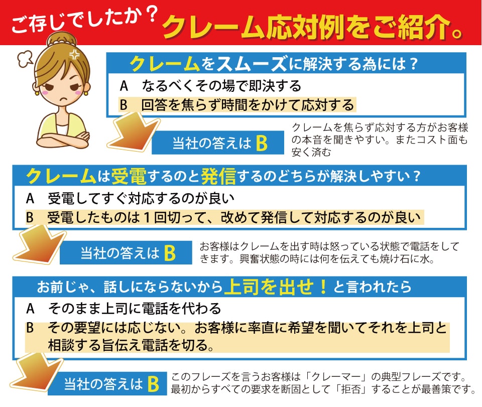 2,クレーム対応は発信する側と突然受ける側どちらが不利か?クレームを円滑に対応する為には、スタッフは常に発信側に回る事です。突然受けて、対応すると用意ができていない為、反射的に回答してしまい、その言葉が命取りになり、後々までひきづってしまう事があります。